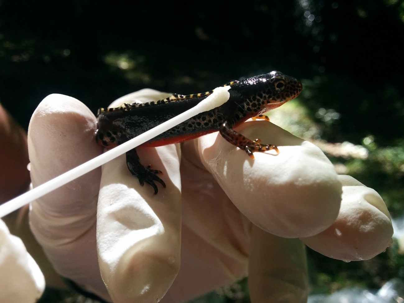 Para conocer si Cantabria cuenta con poblaciones infectadas por el hongo, los guías del Parque Natural de las Marismas de Santoña, Victoria y Joyel colaboramos con el grupo de investigación de la Czech University of Life Sciences, liderado por Jiří Vojar, y en el que trabaja el cántabro David Lastra Gonzalez. Este equipo de investigación desarrolla el estudio de varias poblaciones de salamandras y tritones del norte de España, entre ellas una población cercana al Parque Natural. Para comprobar la existencia del hongo, los anfibios se capturan con extremo cuidado para evitar contaminaciones en su piel, y se le frota la zona ventral con un bastoncillo que se marca y guarda para después analizar la muestra en el laboratorio. Una vez de vuelta a Praga, los investigadores recurren a técnicas como la PCR (tan de moda estos días para la detección del coronavirus) y buscan marcadores genéticos propios del hongo.